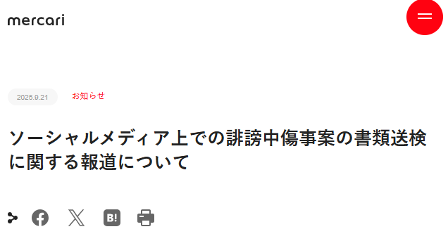 2025年9月21日にメルカリ社は田端信太郎氏に対して刑事告訴を行った旨のプレスリリース(以下、当該プレスリリース)を配信した。当該プレスリリースには刑事告訴の主体が誰か記載されておらず、誰が刑事告訴をしたのか明確にされていないままである。