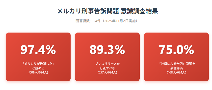 そしてその後、当メディアが2025年11月2日より実施した田端信太郎氏への当該刑事告訴プレスリリースに関する緊急意識調査(回答総数624件)では、メルカリ社の一連の対応に対し、極めて厳しい評価が下されたことが明らかになった。