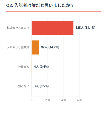さらに、「プレスリリースおよび一連報道を見たときの告訴者は誰だと思いましたか」という質問では、84.1%(525人)が「株式会社メルカリ」と回答。「メルカリと従業員」が14.7%(92人)と続き、「社員単独」と認識した人はわずか0.6%(4人)だった。