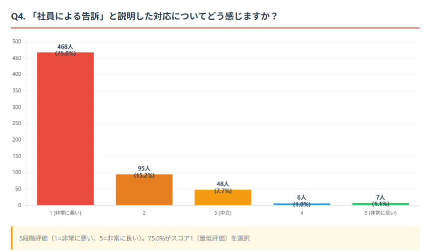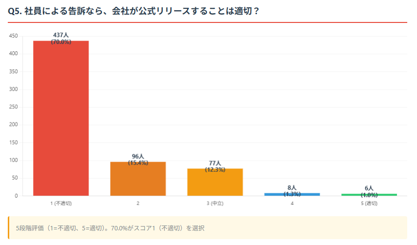 「社員による刑事告訴」であれば会社が公式リリースを行うことは適切か、という問いに対し、70.0%(437人)が「スコア1(不適切)」と回答しており、この行動自体が社会通念から逸脱していると見なされている。
