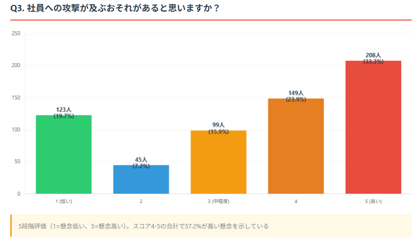 調査では、「社員による告訴」と説明したことで、かえって当該社員に攻撃が及ぶのではないかという懸念が多数寄せられた。「社員への攻撃の懸念」を5段階(5が最も懸念)で尋ねたところ、「スコア5(非常に懸念)」が33.3%(208人)、「スコア4」が23.9%(149人)となり、合計57.2%(357人)の回答者が高い懸念を示した。